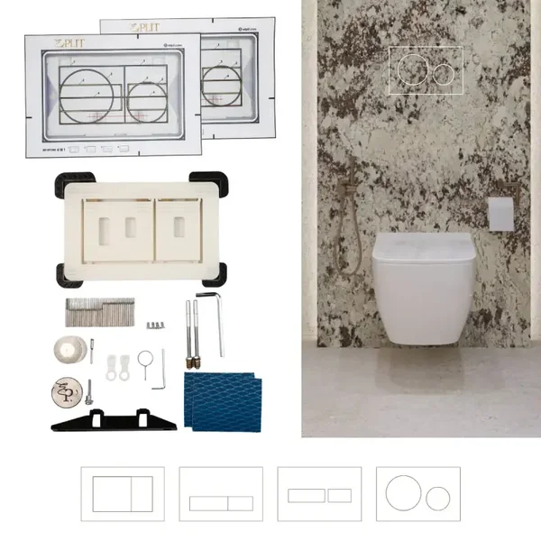 A mechanical system for installing a fully invisible flush button behind the tile. The set includes the flush mechanism, adjustment tools, all components required for installation and consumables for cutting.